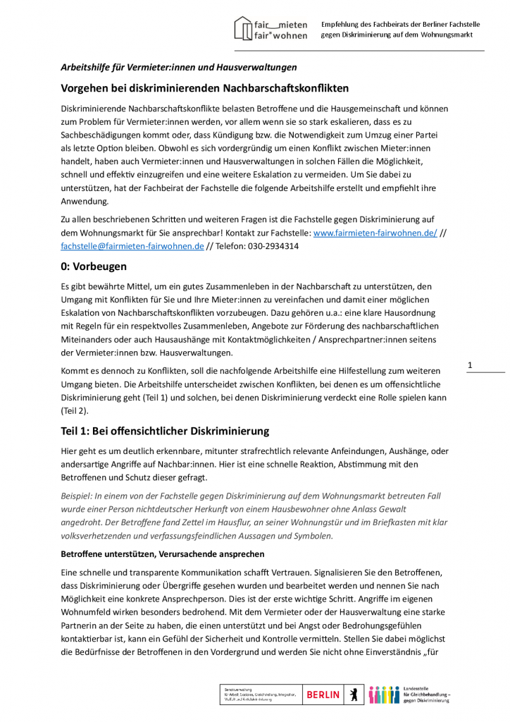 Diese Arbeitshilfe für Vermieter:innen und Hausverwaltungen ist eine Empfehlung des Fachbeirats der Berliner Fachstelle gegen Diskriminierung auf dem Wohnungsmarkt. Vermieter:innen und Hausverwaltungen haben, auch wenn es sich um Konflikte zwischen Mieter:innen handelt, in vielen Fällen die Möglichkeit schnell und effektiv einzugreifen. Mit kurzen Beispielen und Formulierungshilfen gibt die Arbeitshilfe konkrete Tipps und Hilfestellungen.
